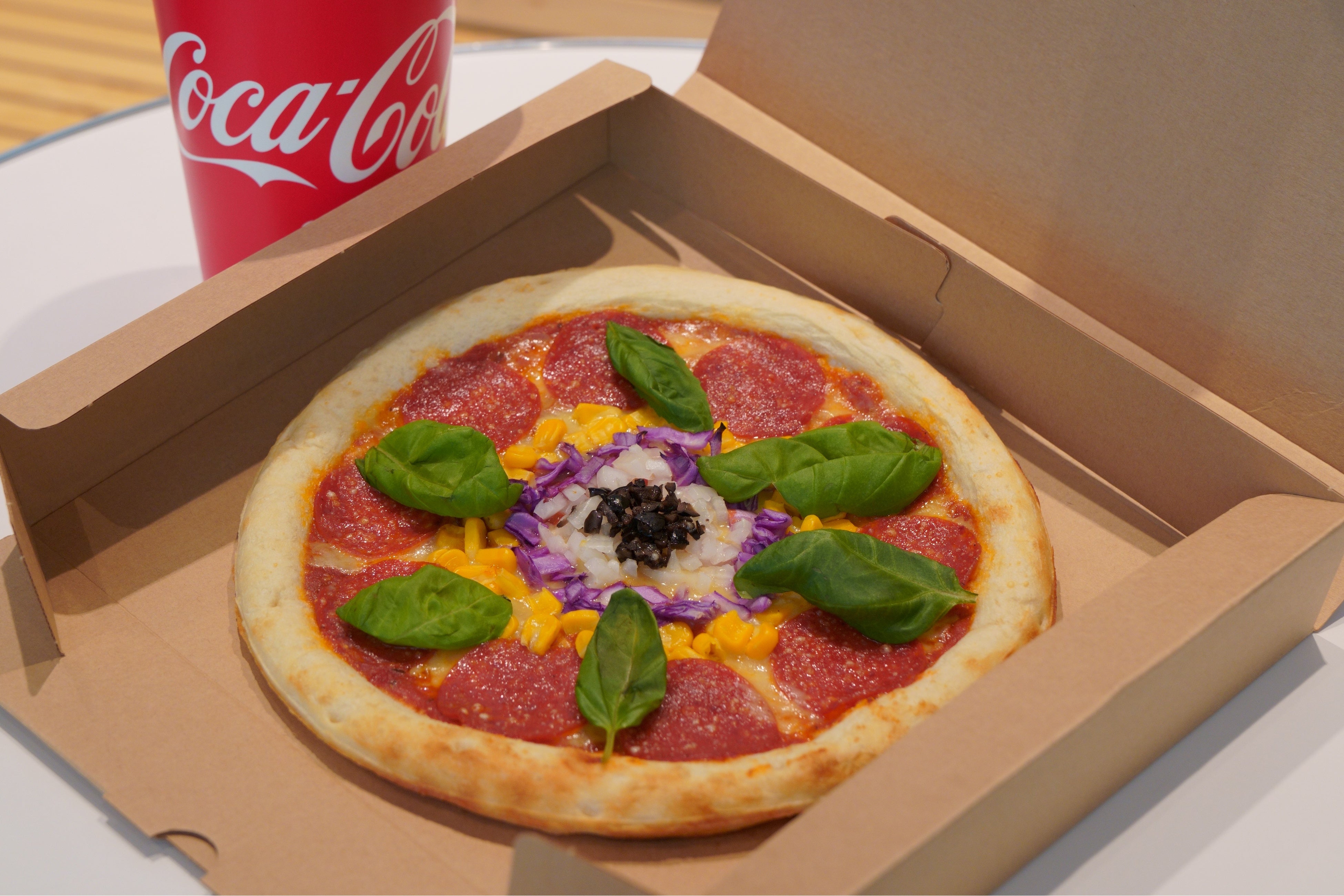 PIST6のレーサーをイメージした6つのトッピング(ペパロニ、オニオン、コーン、バジル、紫キャベツ、オリーブ)が楽しめるピザです。隠し味のアンチョビペーストがポイント!