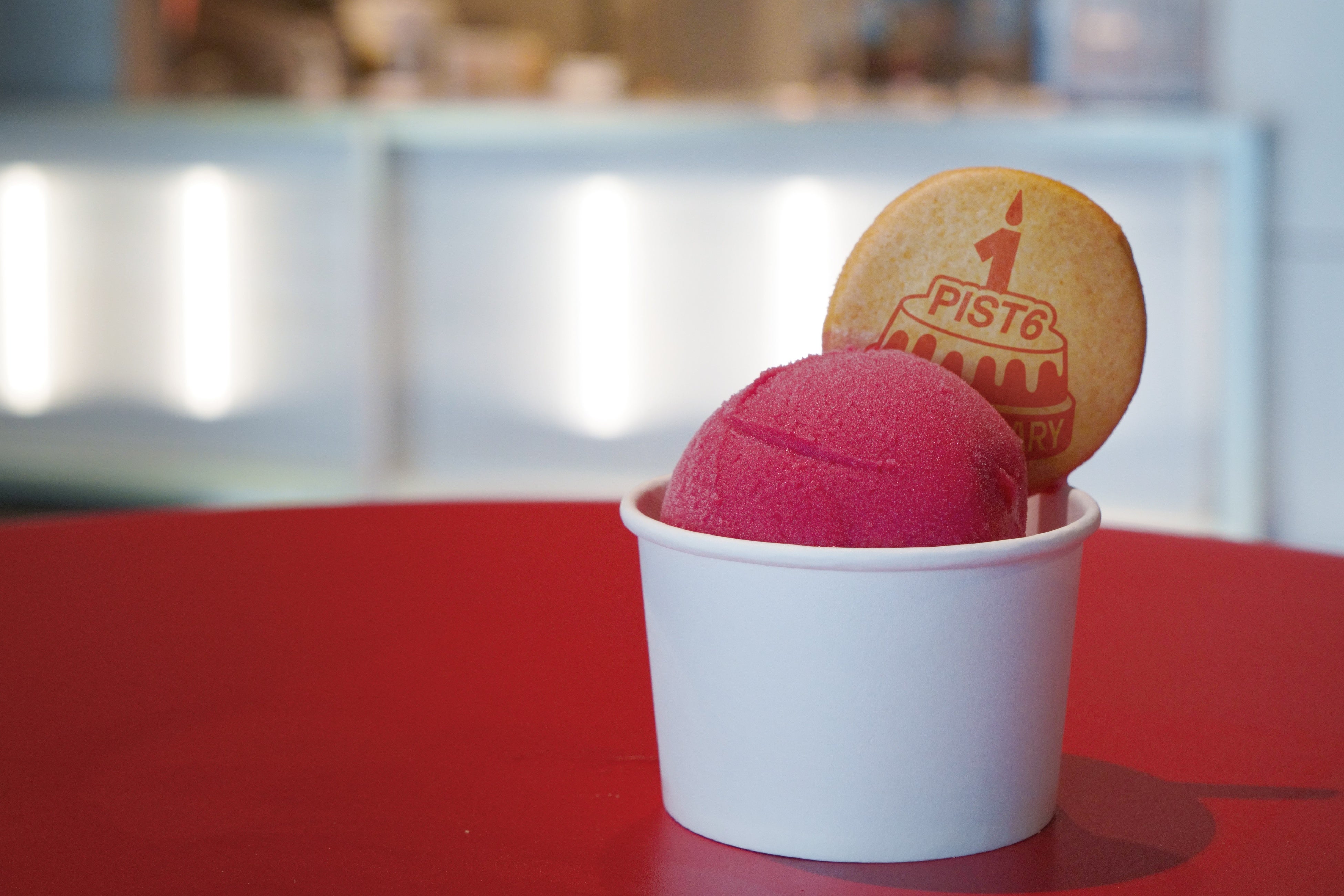 PIST6のロゴカラーをイメージしたフランボワーズのジェラートです。1周年記念のかわいいイラスト入りのクッキーに注目!
