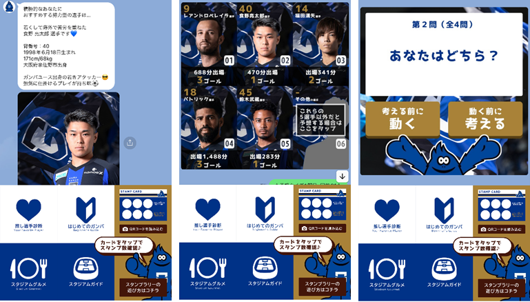 試合以外の体験を楽しんでいただくためのコンテンツです。スタジアム内外の観戦体験を楽しめる3つのスポットを周っていただき、LINE上でのデジタルスタンプを集めていただきます。スタンプの個数に応じて、賞品をご提供いたします。
