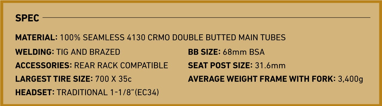 チューブは、クロモリ本来のしなやかさと強度を持たせるために、シームレスの4130スチールダブルバデッドを採用しています。さらにシートステーにロウ付けを施し、シートチューブはハイドロフォーミング加工で、LEADERより引き継いだ特徴的なカットアウトを形成することでクラシックでありながらモダンな雰囲気を醸し出しています。
