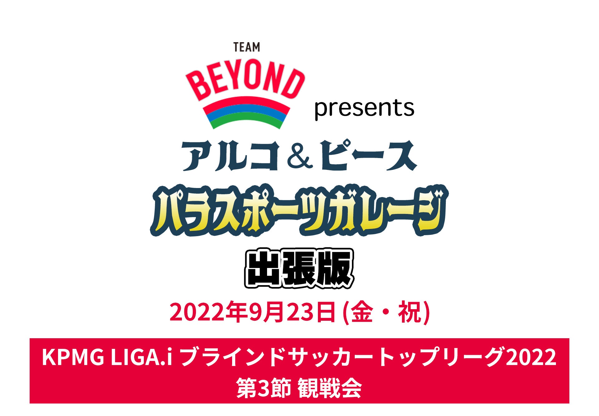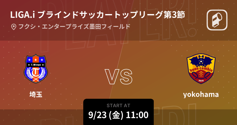 スポーツエンターテイメントアプリPlayer!は、パラスポーツを応援する人を増やす東京都のプロジェクト「TEAM BEYOND」と連携し、「KPMG LIGA.i ブラインドサッカートップリーグ2022 第3節」を9月23日(金)11時から速報いたします。また、当日は試合映像とともに、TBSラジオアナウンサーの実況をPlayer!からもお楽しみいただけます。Player!からブラインドサッカーを応援しましょう!