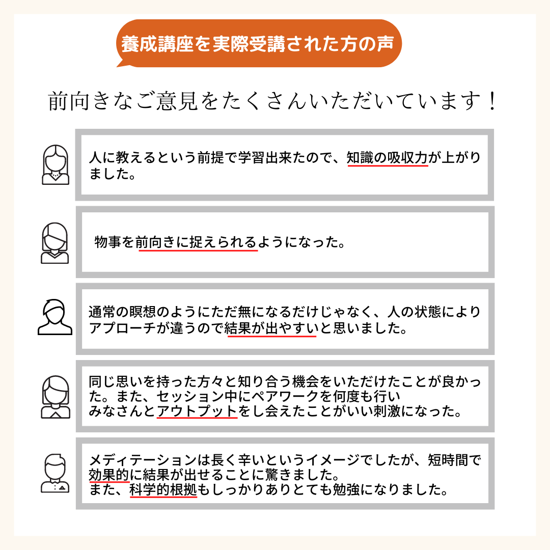 指導者になるための学びですが、それ以前に講師となる参加者お一人お一人の課題や悩みに寄り添い、WINメディテーション®︎を通じて成長する喜びをもっと実感してもらいたい! そう思いました。