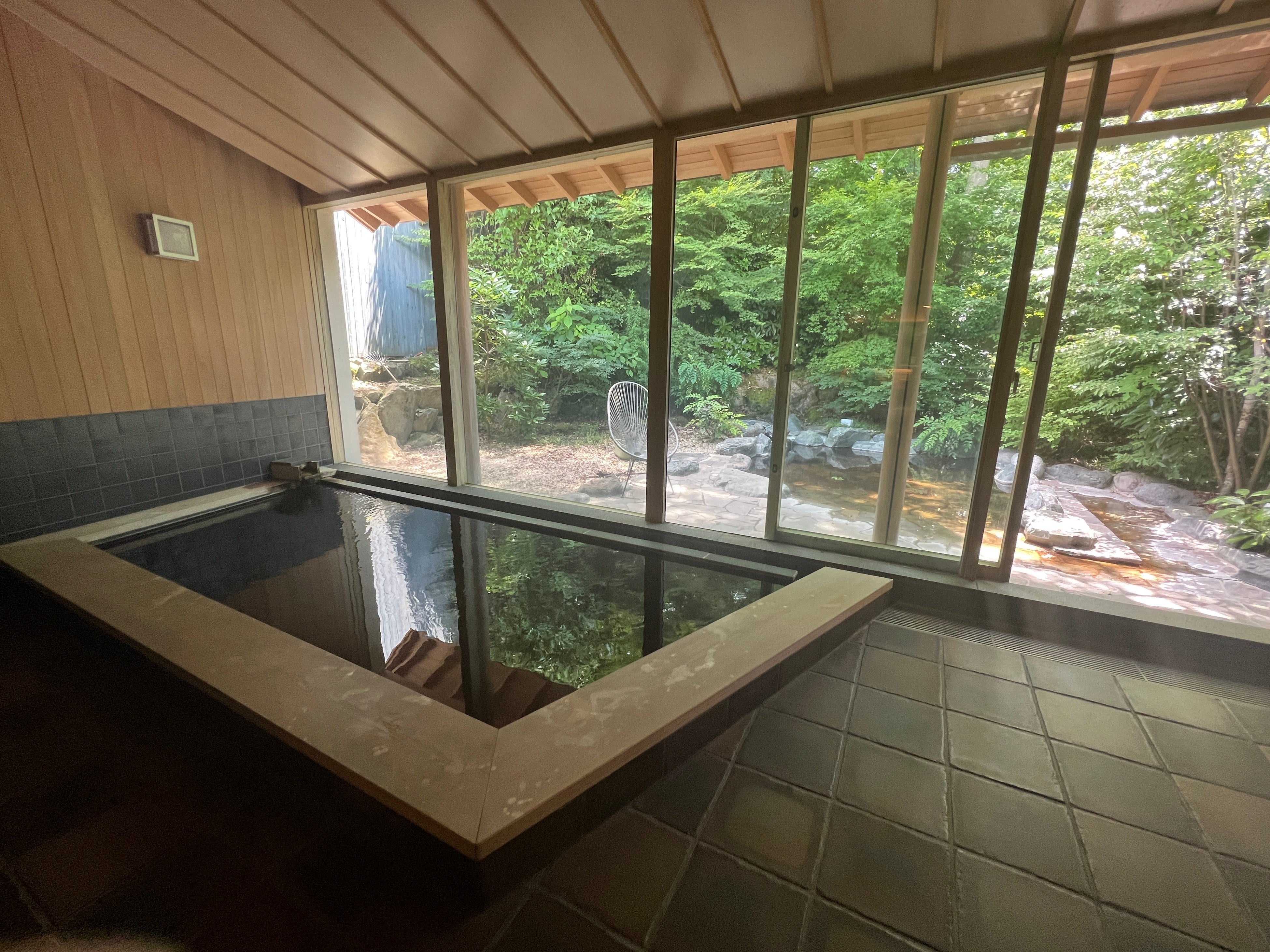 自然を感じながら浸かれる露天風呂とヒノキが香る大きなガラス窓の内風呂。