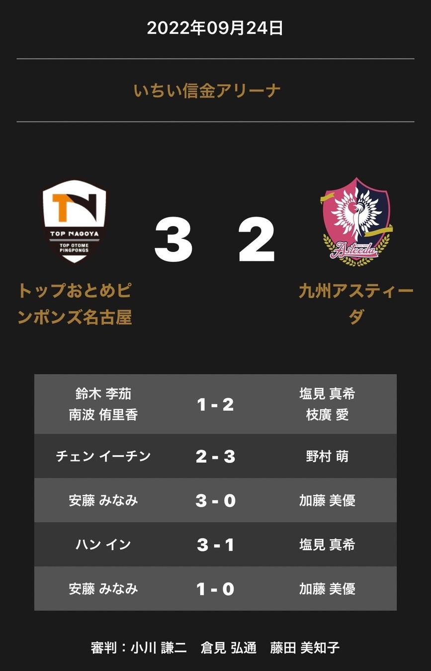 トップおとめピンポンズ名古屋と九州アスティーダの試合は3-2でトップおとめピンポンズ名古屋が勝利しました。