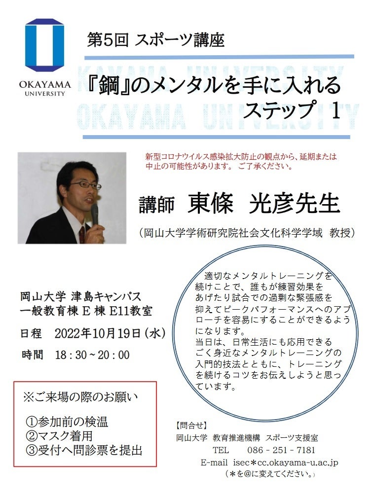 今回、第5回となるスポーツ講座「『鋼』のメンタルを手に入れる ステップ1」を2022年10月19日(水)に岡山大学津島キャンパス(岡山市北区)にて開催します。