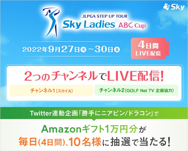 Sky株式会社が特別協賛し、2022年9月27日(火)~9月30日(金)の4日間で開催されるJLPGAステップ・アップ・ツアー「Skyレディース ABC杯」の中継映像を、「Sky株式会社 公式YouTube™チャンネル」にてライブ配信いたします。