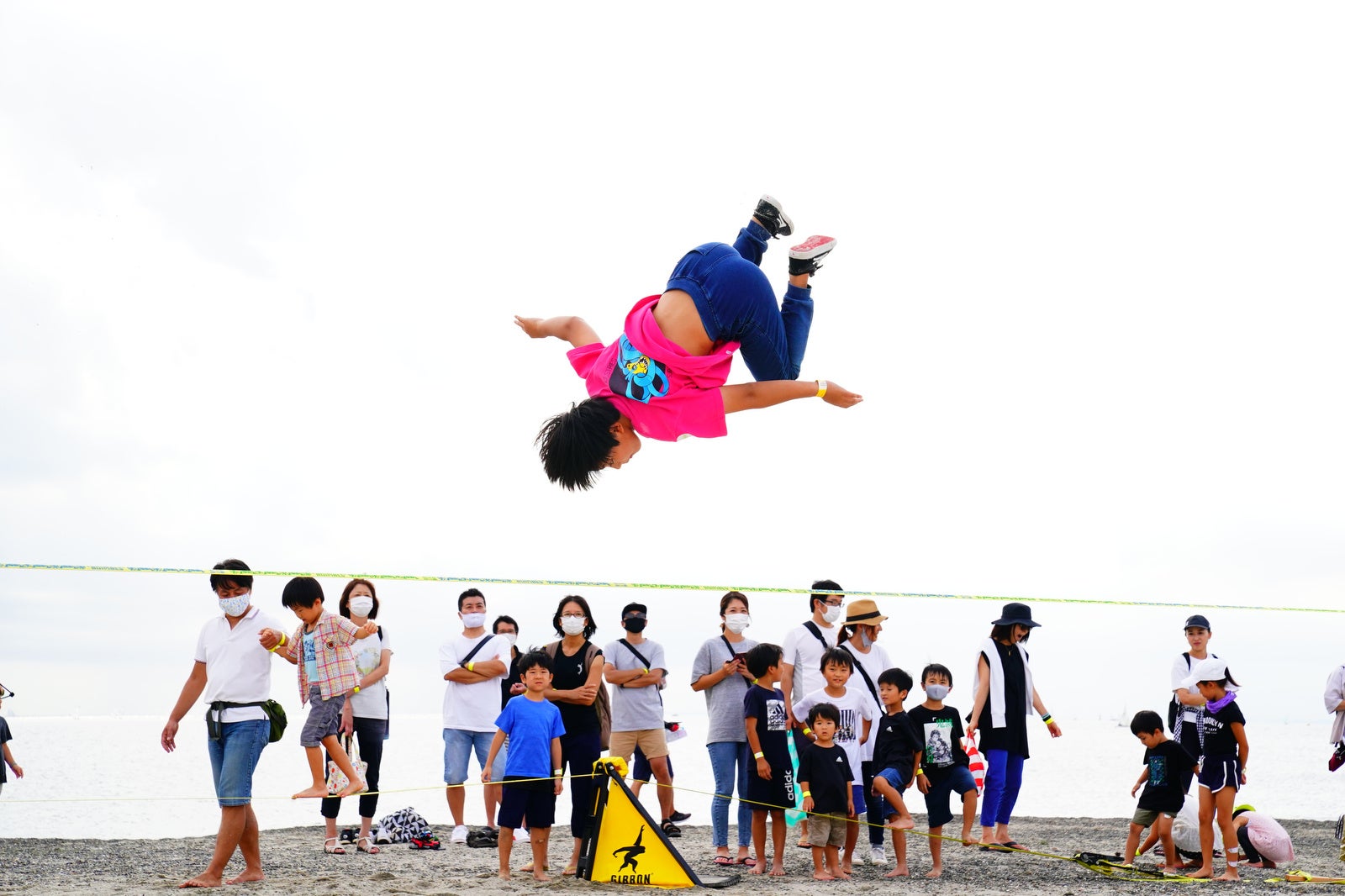 ・5cm幅の細いナイロン製ウェビング(革ひも)を使った綱渡り「スラックライン」は今、最新のエクストリームスポーツです。ウェビングの上でジャンプなど様々なことができます。