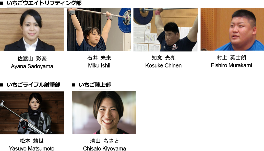 このたび、いちごウエイトリフティング部の佐渡山彩奈選手(女子55kg級)、石井未来選手(女子71kg級)、知念光亮選手(成年男子+109kg級)、村上英士朗選手(成年男子+109kg級)、いちごライフル射撃部 松本靖世選手(50mライフル女子伏射60発競技、50mライフル女子三姿勢競技)、いちご陸上部 清山ちさと選手(成年女子4×100m R、女子100m)の6選手(8競技)が、国内最大のスポーツ祭典である「いちご一会とちぎ国体」(第77回国民体育大会 2022年10月1日~11日開催)に出場することが決定いたしました。