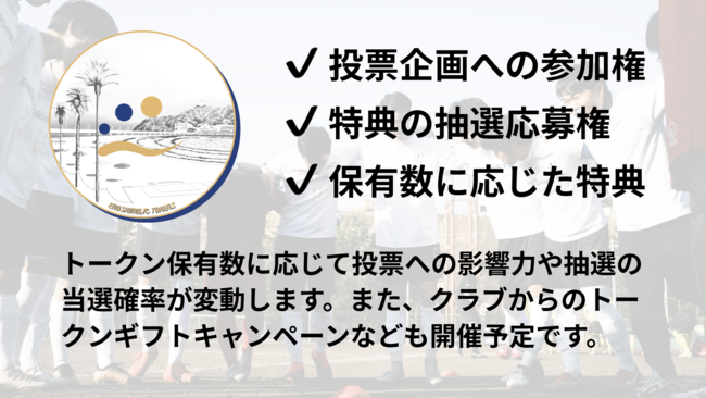 クラブトークンの販売売上は、江の島FCのクラブ運営費用のうち、遠征費や、グラウンド創設費等の強化費に利用しております。クラブトークンを購入いただいた方々は、クラブの投票企画へのご参加や、参加型イベントへの招待、特典抽選などへ応募いただくことができます。これからの江の島FCを育てていく共同運営者となって、共に新しい体験をつくり上げていきましょう。(https://financie.jp/communities/enoshimafc)