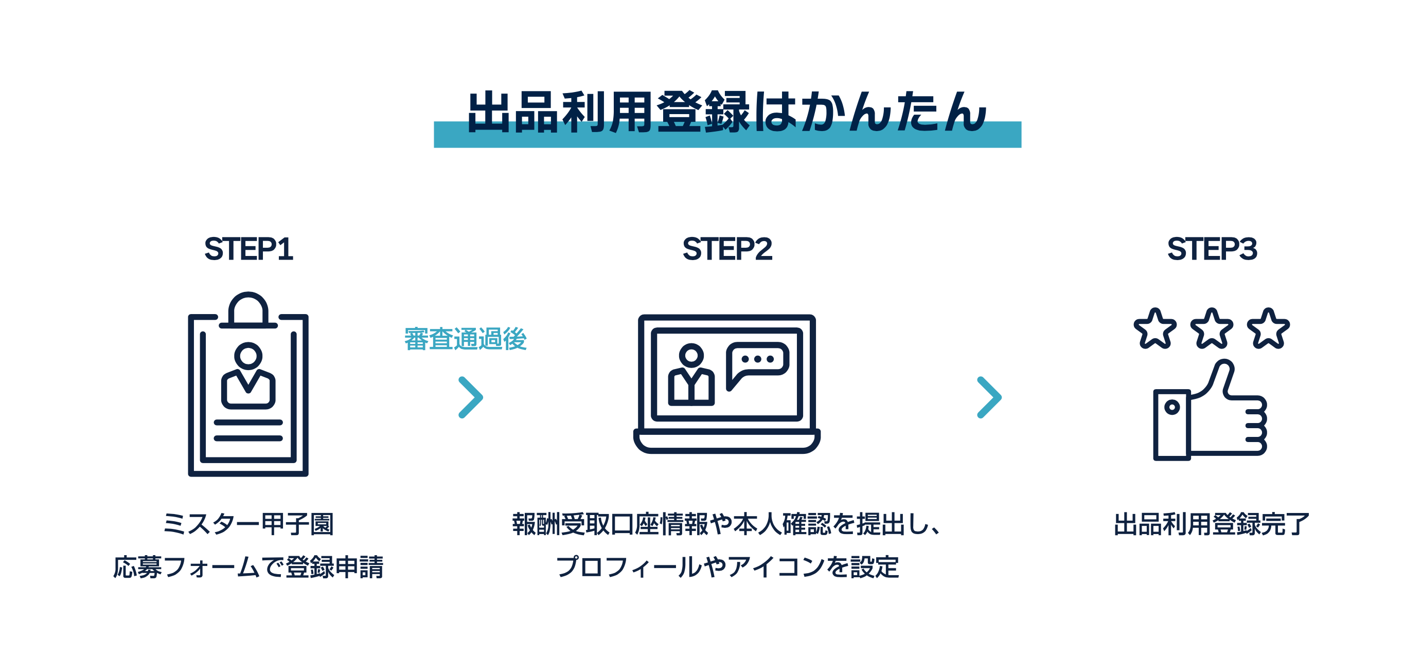 ミスター甲子園でサービスを出品するには、ミスター甲子園運営事務局による審査が必要です。応募条件は甲子園(全国高等学校野球選手権大会または選抜高等学校野球大会)に出場した選手とし、ベンチ入りの選手も含むものとします。
