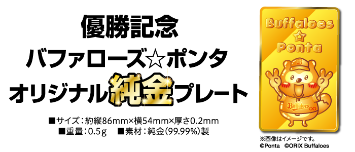 期間中、キャンペーンページからのエントリーおよびPonta提携店舗・サービスでのお買い上げでPontaポイントをためていただくと、抽選に参加いただけます。1Pontaポイント以上ためていただいた方の中から抽選で30,000名様に200Pontaポイント、10Pontaポイント以上ためていただいた方の中から抽選で200名様に20,000Pontaポイントをプレゼントします。またエントリーのみでも、優勝記念のバファローズ☆ポンタオリジナル純金プレートが50名様に当たる抽選に参加いただけます。