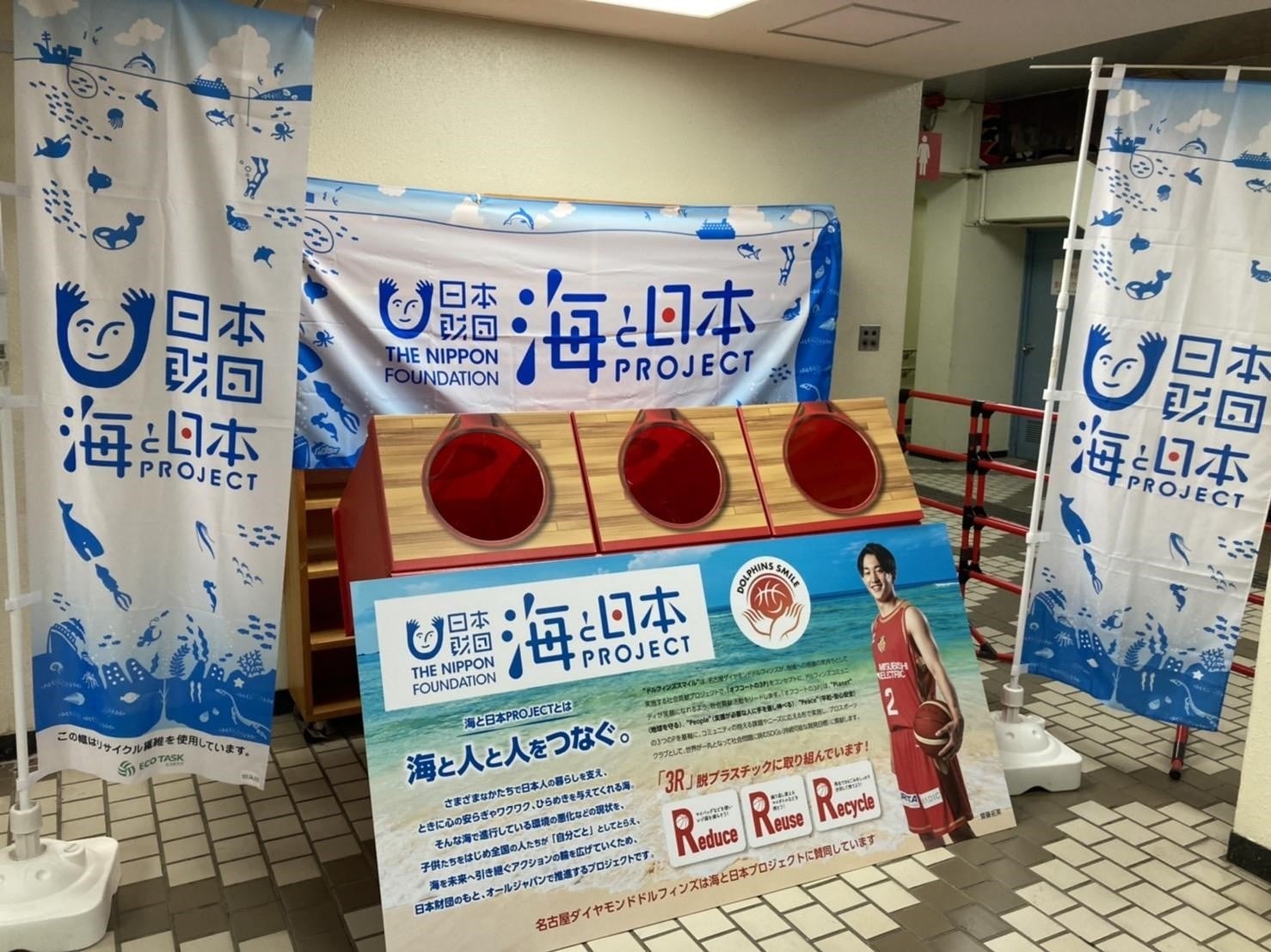 名古屋ダイヤモンドドルフィンズのホームアリーナは愛知県が管理する愛知県体育館。海と日本プロジェクトとコラボレーションしたごみ箱をシーズンを通して設置し、観客が捨てるペットボトルを中心としたごみへの意識促進を狙います。