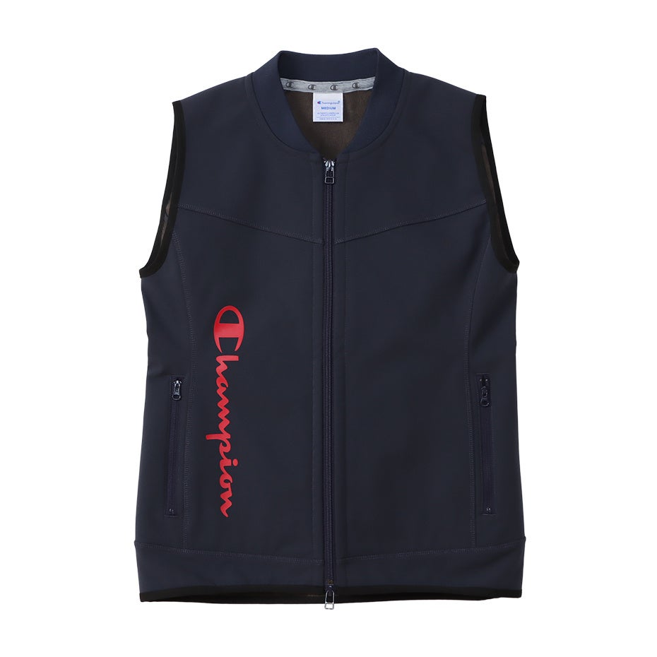 表面に伸縮性のある捲縮(けんしゅく)糸を使用したポリエステル素材、裏面に毛足の短いポリエステルフリース、中間に保温性を高めるシートを挟み込んだ三層構造で、優れたストレッチ性と保温性に加え、撥水機能も備えたジップベストです。脱ぎ着しやすいダブルジップ仕様で、両サイドにジップポケット付き。正面にChampion(チャンピオン)ロゴをプリントで入れています。フーデッドジャケットの上に羽織ることもできるシャープな襟形状もポイント。ベーシックなカラーでコーディネートしやすいアイテムです。