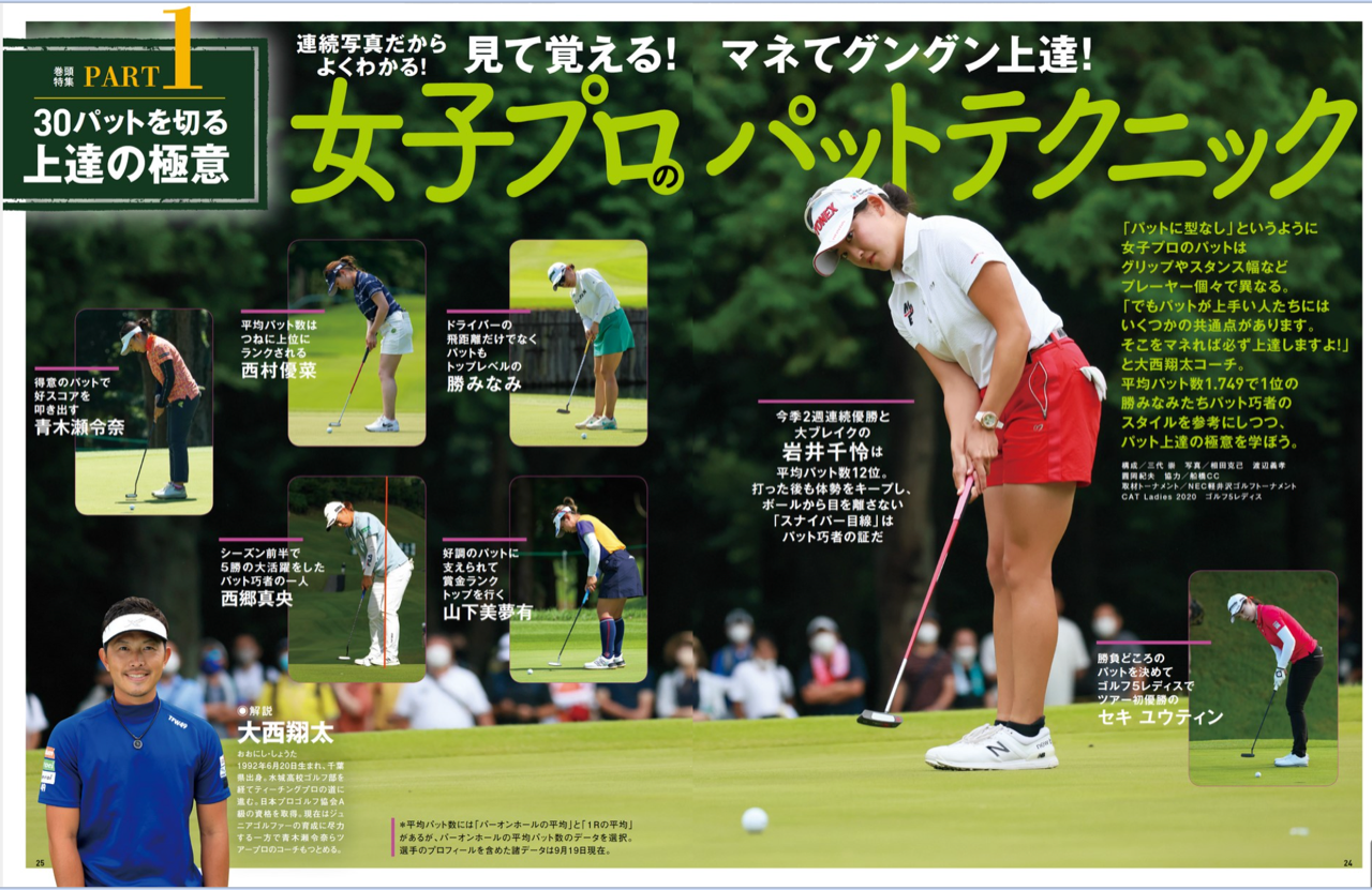 - 20 巻頭特集 80台スコアを出すなら35パット以下を目指そう! PART-1 連続写真だからよくわかる! 30パットを切る女子プロのテクニック