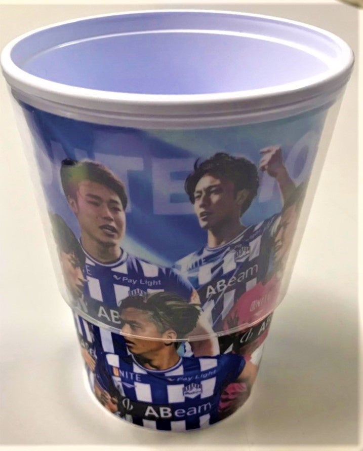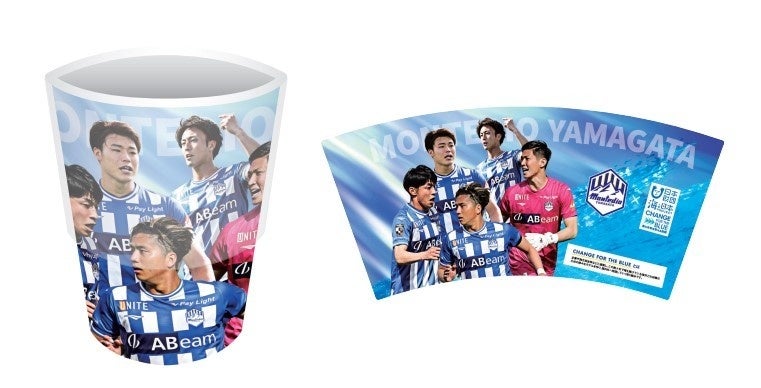 海をイメージしたブルーをベースに、モンテディオ山形の選手がデザインされたカップは、再利用可能なリユースカップです。
