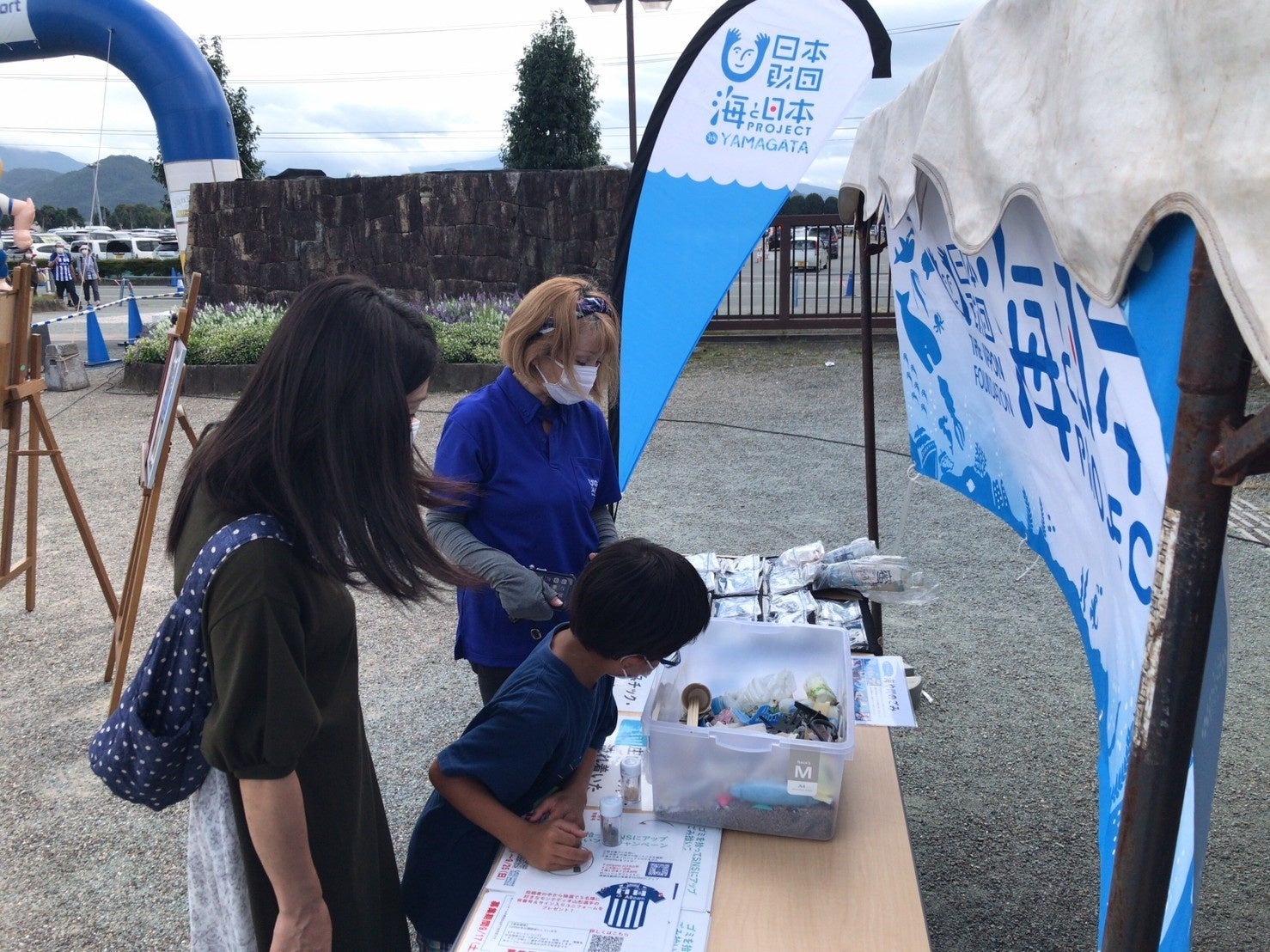 試合会場には海と日本プロジェクト特設ブースを設置しました。ブースには実際に山形の海に流れ着いた海洋ごみの展示を行い、会場に来た方へ海洋ごみ問題の現状を伝える場となりました。ブースに訪れた方は実際の海洋ごみを手に取り、ごみの種類やマイクロプラスチックの小ささに驚いている様子でした。