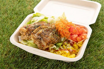 メニュー紹介/粒立ちが良い雪若丸のサフランライスは甘辛い味付け。ジューシーなグリルチキンと野菜たっぷりなクセになる一品。
