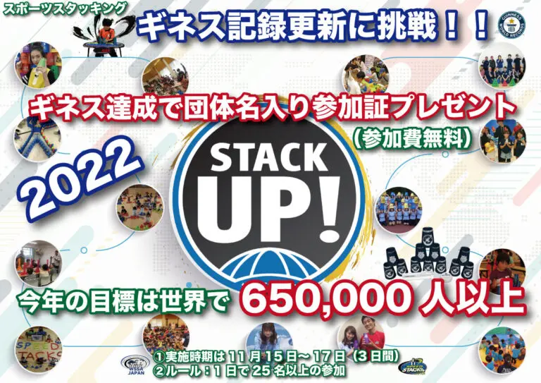 毎年WSSA各国の協会が参加しギネス記録にチャレンジするスポーツスタッキングの挑戦イベントです。