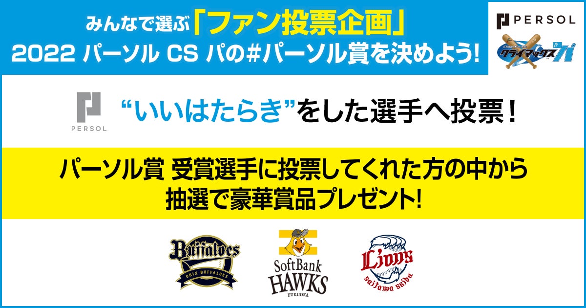 パシフィックリーグマーケティング株式会社(本社:東京都中央区、代表取締役CEO:根岸 友喜)は、2021年度パシフィック・リーグオフィシャルスポンサーである総合人材サービスのパーソルホールディングス株式会社(本社:東京都港区、代表取締役社長 CEO:和田 孝雄)が、「2022 パーソル クライマックスシリーズ パ」のパーソル賞をファン投票で決定し、抽選で豪華賞品が当たるキャンペーンを実施することをご案内いたします。