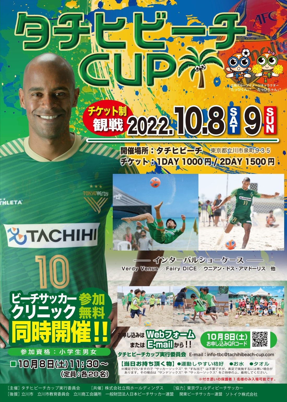 「タヒチビーチCUP」は、東京ヴェルディBSの拠点でもある東京都立川市における地域振興を目的として毎年開催されている、日本最大のビーチサッカー賞金大会です。今年も東京都立川市のタチヒビーチにて開催されます。
