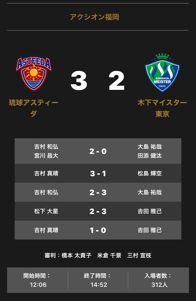 ホームプレスリリース ノジマTリーグ 2022-2023シーズン 公式戦 10月8日 琉球アスティーダ vs 木下マイスター東京 試合結果 2022年10月08日 15時38分 公開|スポーツマニア編集部プレスリリース 一般社団法人Tリーグのプレスリリース ノジマTリーグ 2022-2023シーズン 公式戦 10月8日 琉球アスティーダ vs 木下マイスター東京 の試合結果は3‐2で琉球アスティーダが勝利しました。