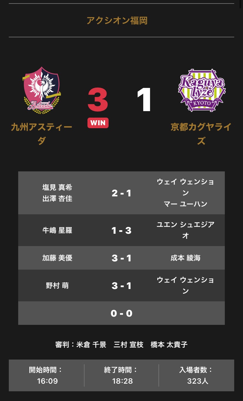 ホームプレスリリース ノジマTリーグ 2022-2023シーズン 公式戦 10月8日開催 九州アスティーダ vs 京都カグヤライズ 試合結果 2022年10月08日 20時08分 公開|スポーツマニア編集部プレスリリース 一般社団法人Tリーグのプレスリリース ノジマTリーグ 2022-2023シーズン 公式戦 10月8日開催 九州アスティーダ vs 京都カグヤライズの試合は 3‐1で九州アスティーダが勝利しました。