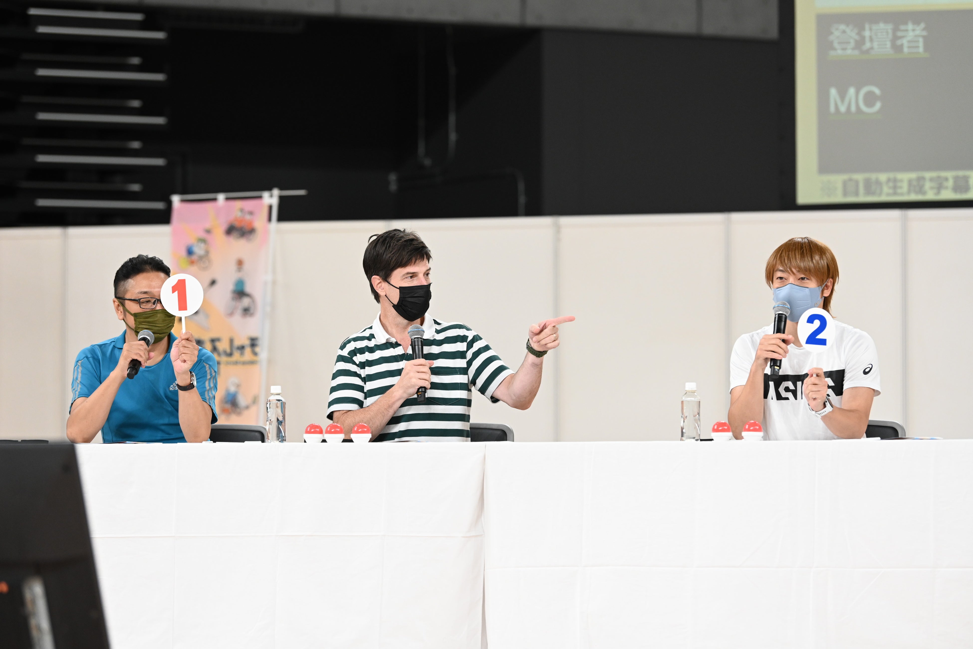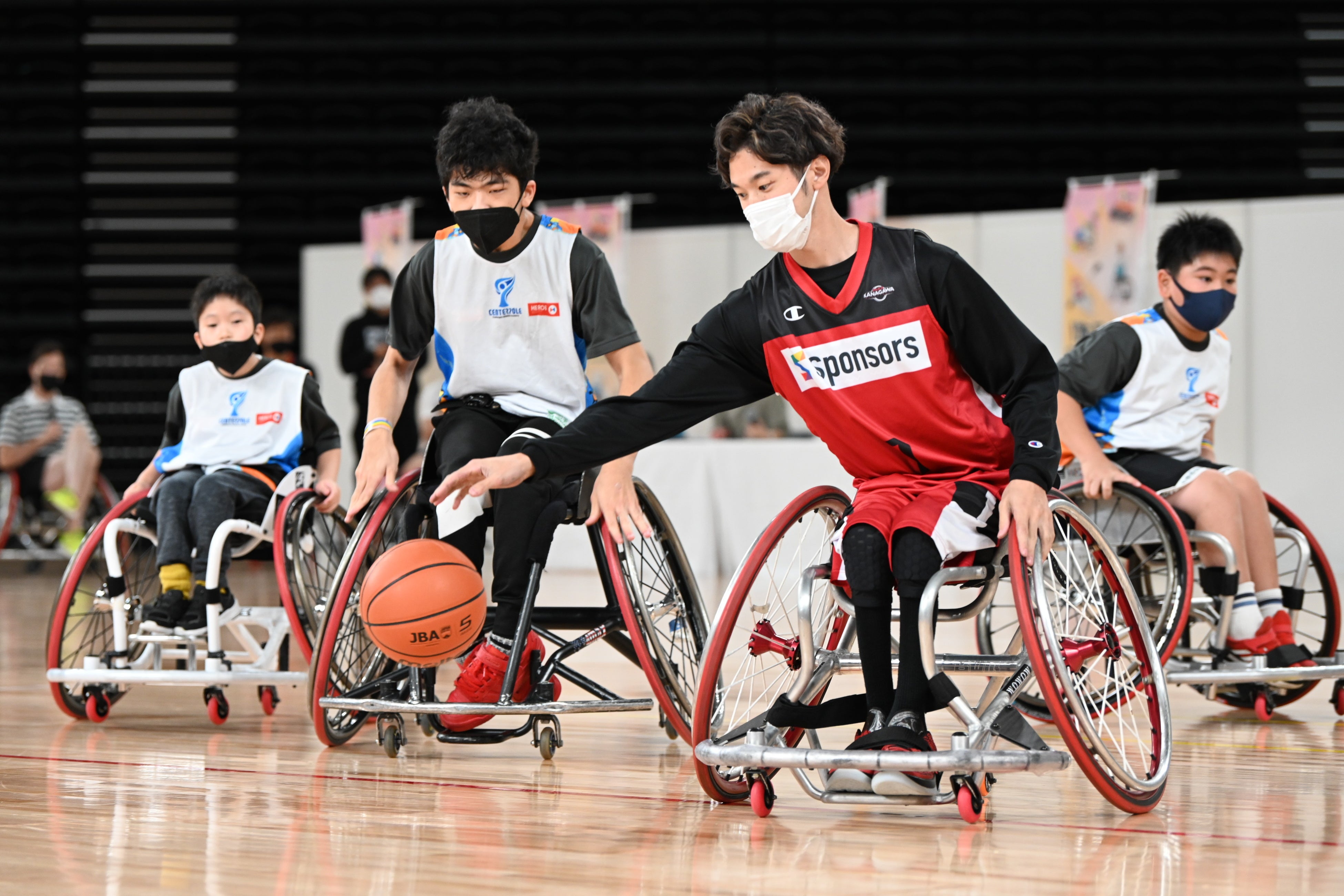 車いすバスケットボールの対戦企画では「根木慎志」さん、「西村元樹」選手、「古澤拓也」選手とお笑い芸人の 「パックンマックン」、「おばたのお兄さん」が登場し、子供たちと熱い対戦を繰り広げました。「根木慎志」さん は、参加者に向けて「車いすバスケットボールを通じて、みんながそれぞれコートの中で輝いている。これぞ、これ から世の中が目指していく社会がコートの中にあったと思う。色んなことで楽しんでいるものができたらと思うし、 また試合ができたら。」とメッセージを送りました。