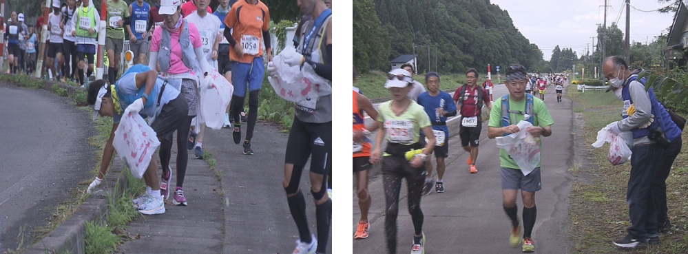 険しい峠や田園地帯を超えてゴールを目指す100キロチャレンジマラソン。プロギングにチャレンジするランナーには、山並み100キロ走破を目指す過酷なレースの為、身体の事を第一に考え、無理のない範囲での100キロのプロギングチャレンジをお願いしました。山間といえどもコース上からは、車からポイ捨てされた、たばこの吸殻や空き缶、ペットボトル、お弁当の空き箱などのごみが道の片隅や、草むらから沢山回収されました。