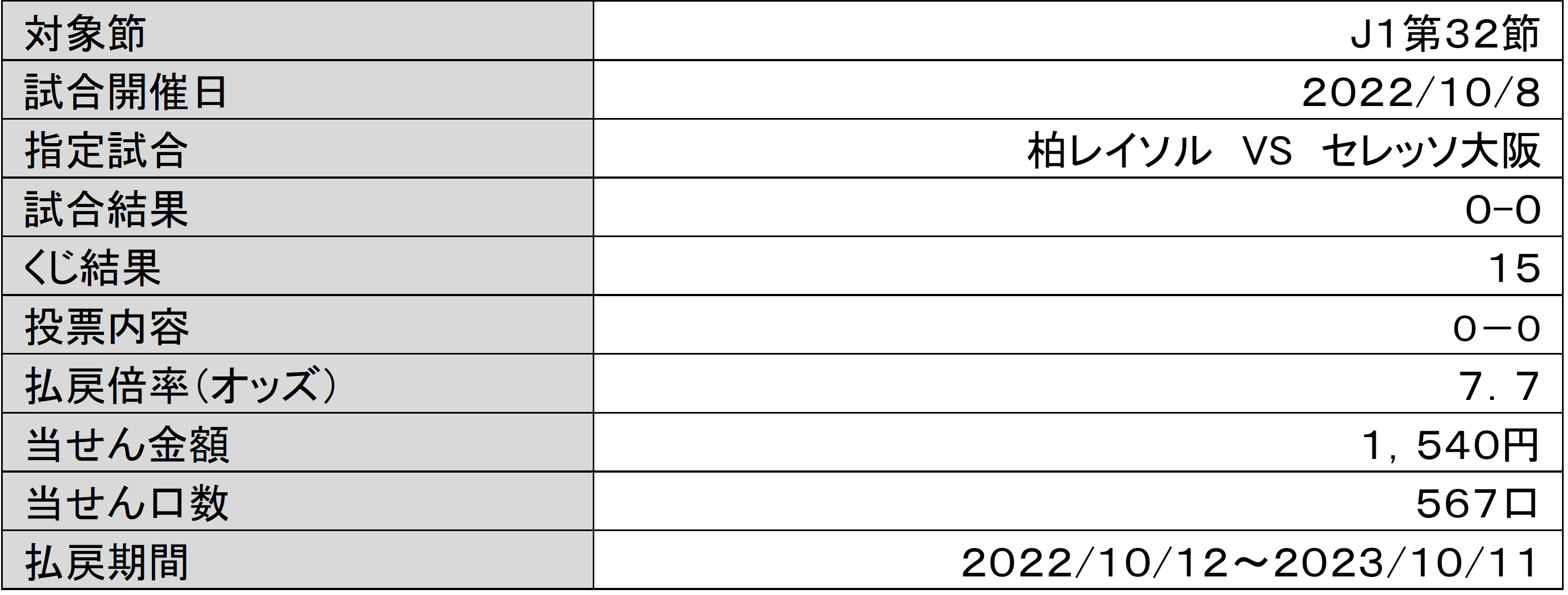 現在4位のセレッソ大阪は、10月22日(土)にルヴァンカップの決勝を控え、ACL出場権獲得に向けて負けられない戦いが続く中、アウェーで行われたJ1第32節柏レイソルvsセレッソ大阪は0-0で、引き分けとなり、払戻倍率(オッズ)は7.7、当せん金は1,540円になりました。