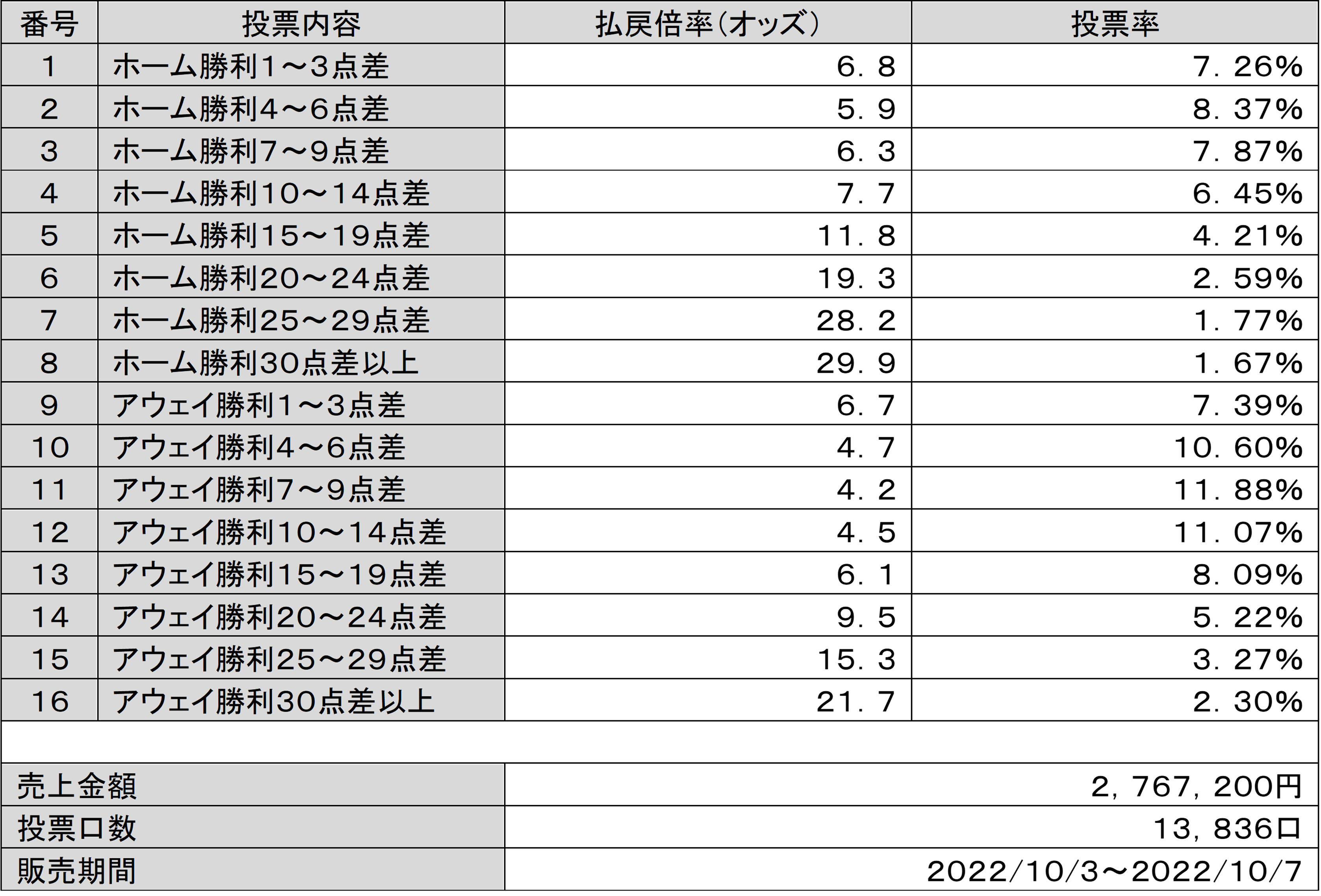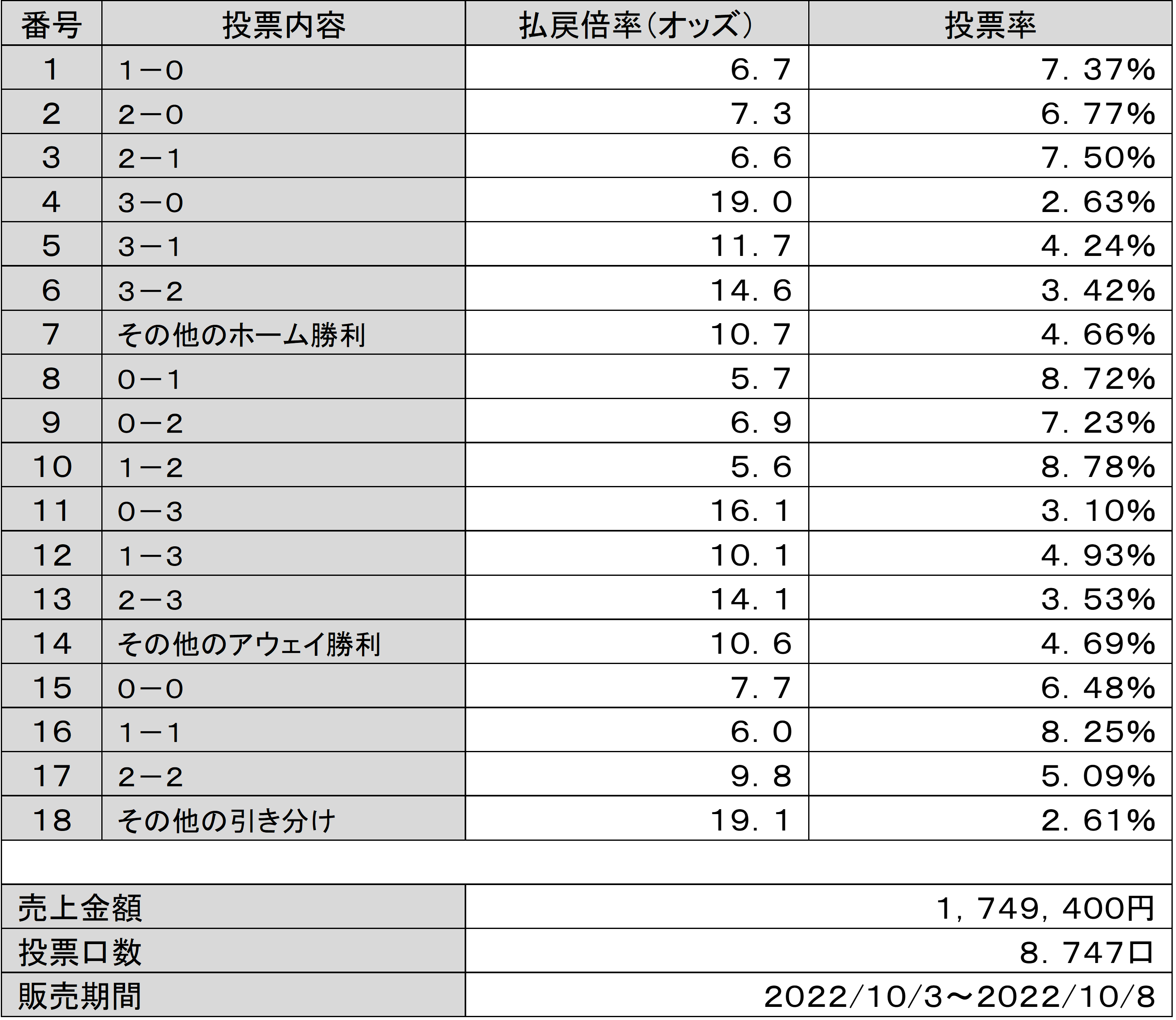 10月7日(金)から10月9日(日)にかけて行われた第3回「WINNERサッカー・バスケ1試合予想」の指定試合であるJ1第32節、J2第40節、J3第28節および B.LEAGUE 2022-23シーズンB1、B2第2節の払戻倍率(オッズ)を公開いたします。