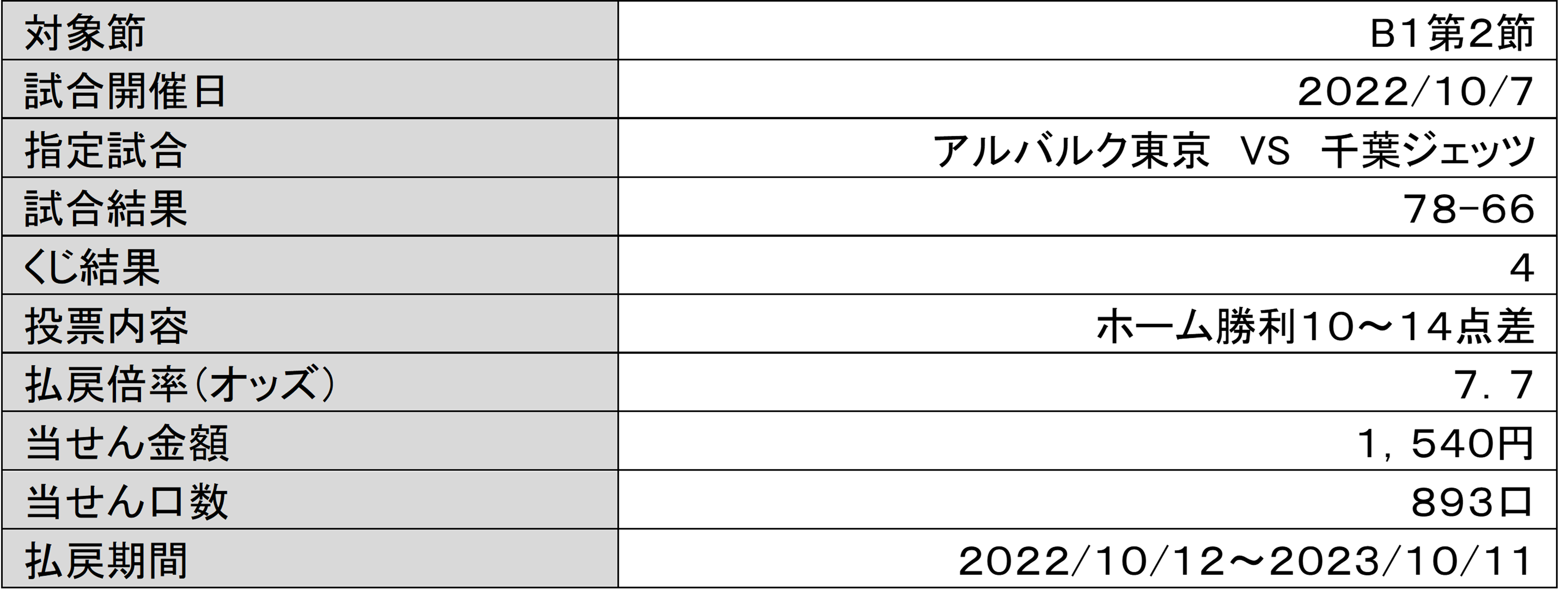 過去2度ファイナルで対戦した注目カードが開幕2週目にして実現、B1第2節アルバルク東京vs千葉ジェッツは78-66で、アルバルク東京の勝利となり、払戻倍率(オッズ)は7.7、当せん金は1,540円になりました。