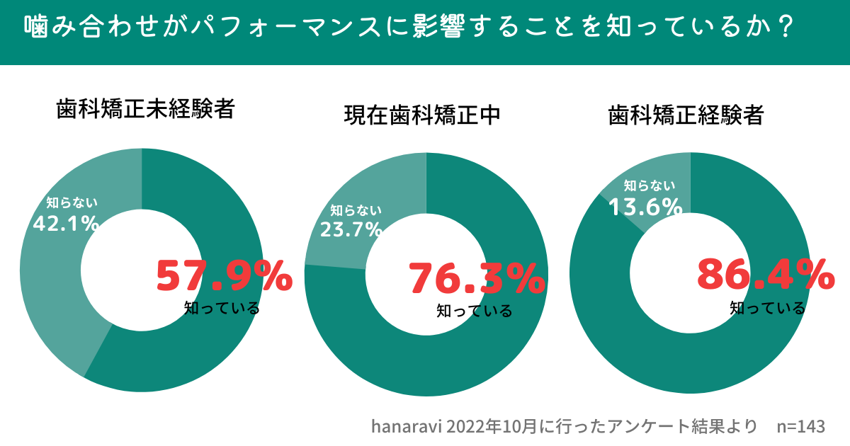 「歯並びがスポーツのパフォーマンスに影響することを知っていますか?」(=143)という質問を行なったところ、「知っている」と回答したのは、