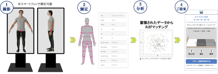 正面と側面の全身写真を撮影し、身長、体重、性別、年齢を入力するだけで体形に合った寝具の硬さパターンを瞬時に測定。