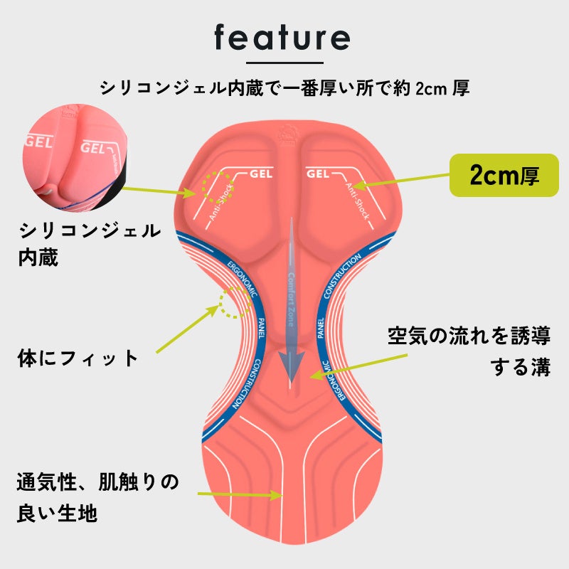 人体工学に基づき、お尻、会陰部に、衝撃吸収の分厚い約2cmシリコンジェル内蔵パッドを配置
