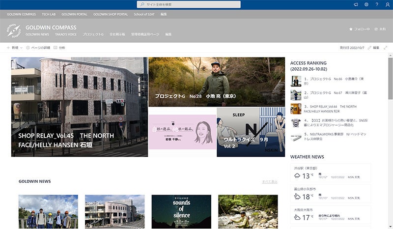 ■企画内容:「Share point」を利用することで、セキュリティの担保や従業員同士のコミュニケーションをスムーズにし、経費精算から書類関係などの業務で必要となる情報まで、さまざまな社内情報を包括することで、「GOLDWIN COMPASS」ひとつで社内情報が全て確認できる、というサイト設計を意識した媒体です。