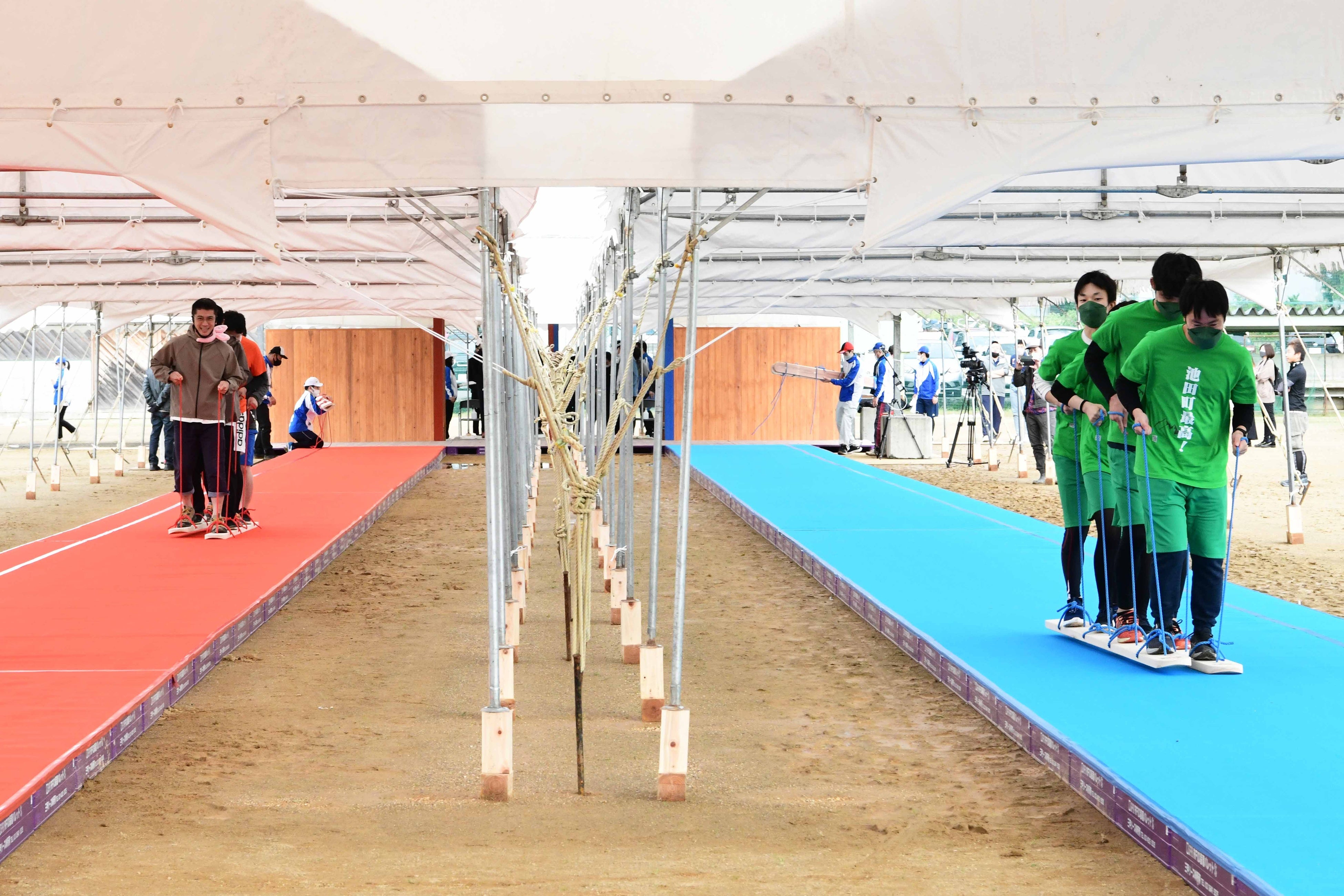 ウッドスポーツには「木ッター」「立ッター」「ゲッター」の3種目があります。今大会種目「ゲッター」は長い下駄を履き直線コースを駆け抜ける、選手同士の協働が勝利へのカギを握る競技です。