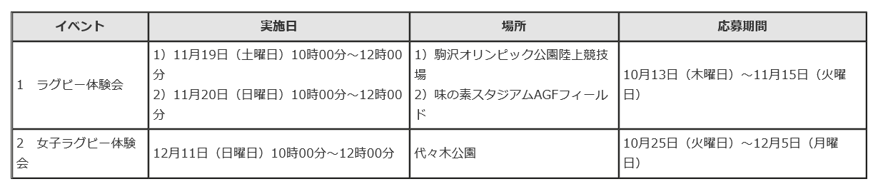 ラグビー体験会:10月13日(木曜日)から11月15日(火曜日)まで