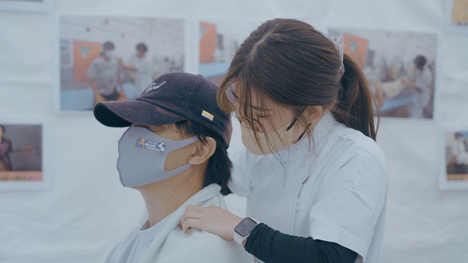 場外に設置した首都医校のブースでは、高度作業療法学科・作業療法学科による「選手のサイン入り革でキーホルダーづくり・作業療法体験」、「応援前や応援後の疲労回復~身体のゆがみチェック・手技療法体験」では、看護系の学科は「脈拍(心拍)」や「血圧」を測るバイタル、アスレティックトレーナー学科はゆがみのチェック、柔道整復学科は手技療法、鍼灸学科は置き鍼治療など、各分野の特色を活かした健康チェックを行いました。子どもからお年寄りの方まで多くの方に参加いただきました。参加者からは、「身体が軽くなった」「その職業について身近に感じることができた」など、満足してもらいました。学生も、「さまざまな年齢の方と接したことで、今後の実習に役立てたい」と学生にも実りあるイベントになりました。
