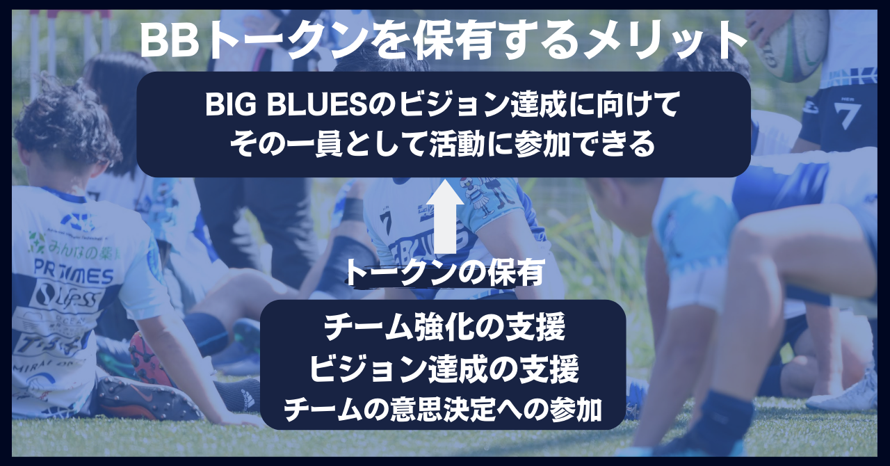 BIG BLUESはトークンを活用することで、「試合に勝ちLEAGUE ONEへの昇格」そして「ラグビーを通じて地域と社会に恩返しをする」この両輪をビジョンに掲げ、前進して参ります。