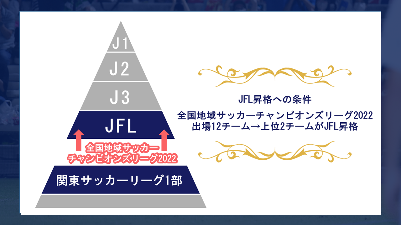 関東サッカーリーグ優勝を成し遂げて出場権を得た「全国地域サッカーチャンピオンズリーグ2022(以下、全国地域CL)」を勝ち上がり、JFLへの昇格を目標としています。