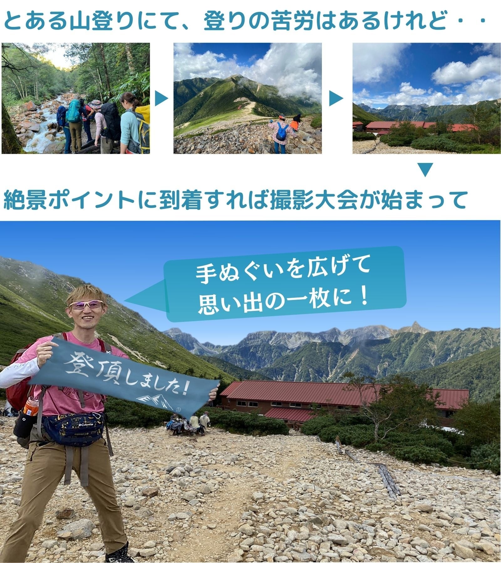 ・山登りの記念撮影などに!ココロの叫びをメッセージ手ぬぐいで伝えて、思い出をもっと豊かに
