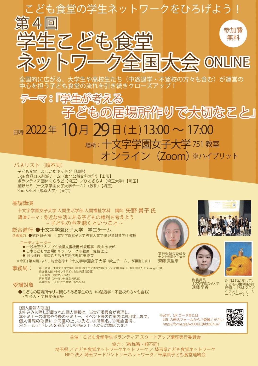 そんな、学生達が日頃の活動の発表や悩み事を共有出来る場所が”学生子ども食堂全国大会”です。第4回目となる今回は埼玉県新座市にある十文字学園女子大学にて対面とオンラインのハイブリッドで開催します。