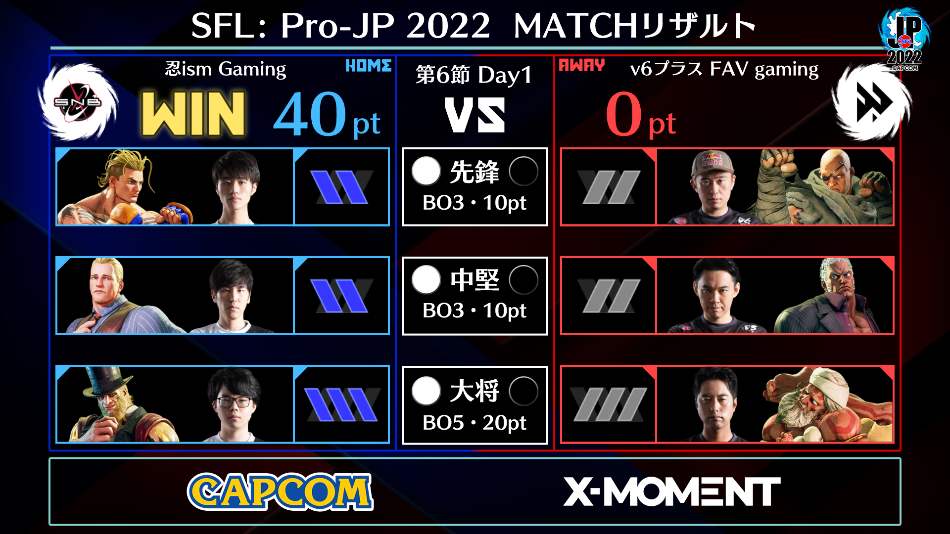 先鋒戦、アウェイ側「v6プラス FAV gaming」は、ボンちゃん選手が登場。予想外となるサガットを選択した変則的なオーダーと思われた。対するホーム側「忍ism Gaming」は、ヤマグチ選手のルークをぶつける形となった。ボンちゃん選手は素晴らしいルーク対策を見せるもののあと一歩届かない展開。それに対しヤマグチ選手は、中間距離での差し込みや、良いタイミングのジャンプ攻撃が刺さる形で、1BATTLEも落とさずにストレートで勝利した。