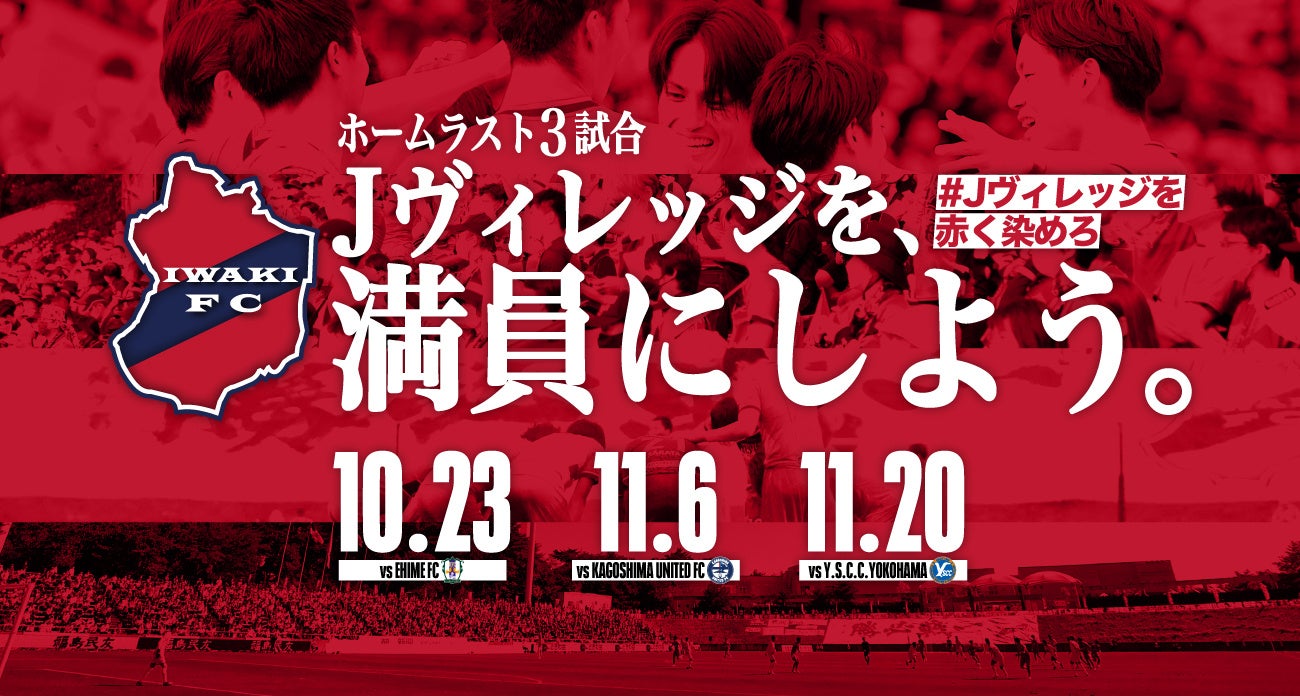 このたびいわきFCは、ラスト3試合となった今季のホームゲームを盛り上げ、満員のスタジアムで選手たちを後押ししたいという思いから、「ホームラスト3試合!Jヴィレッジを、満員にしよう。」プロジェクトと銘打ち、各種招待企画や、応援グッズプレゼント企画を実施しますので、お知らせいたします。ともに最高の熱狂空間をつくりあげましょう。