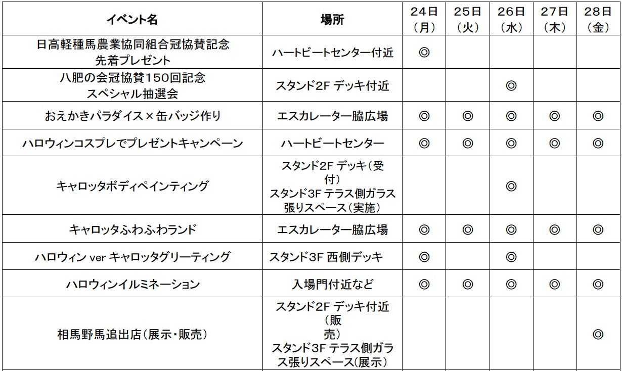 船橋競馬では、令和4年度第7回船橋競馬〔令和4年10月24日(月)〜28日(金)〕について、新型コロナウイルス感染拡大防止対策を講じた上で、滞留人数3,000人(うち特別観覧席166人)までの有観客開催となります。場内イベントのお知らせは、次頁以降に詳細を記載しておりますのでご覧ください。また、入場および施設の利用につきましては、「令和4年度第6回から第8回までの船橋競馬の入場について」(https://blog.f-keiba.com/info/2022/09/post-318c.html)をご確認ください。