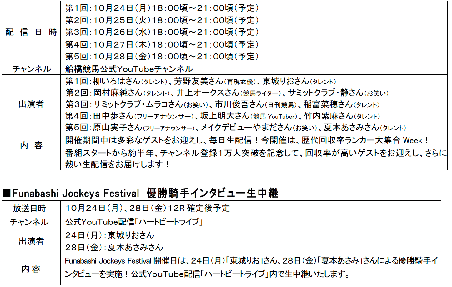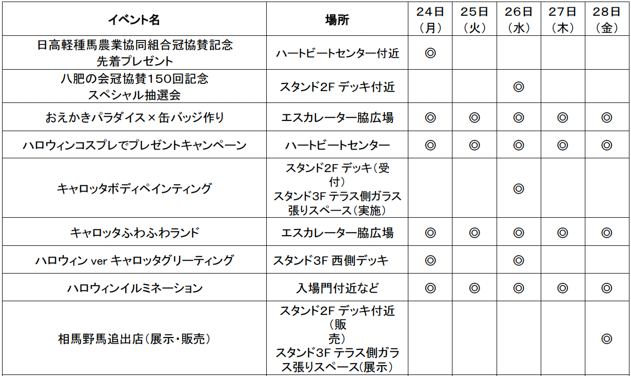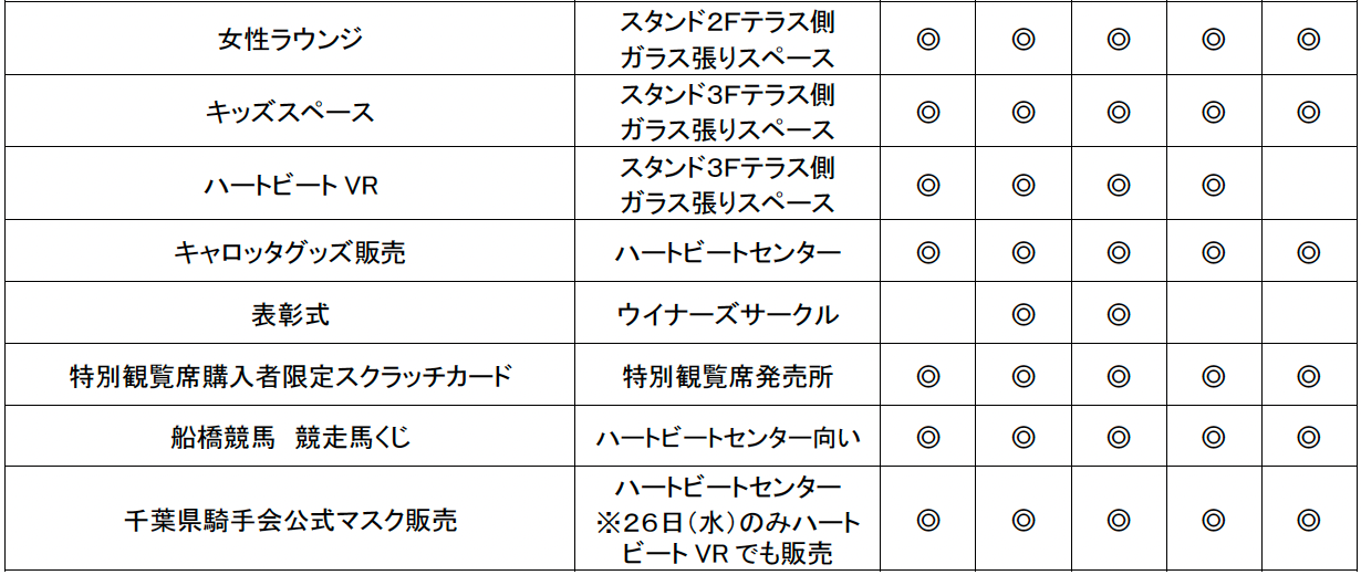 船橋競馬では、令和4年度第7回船橋競馬〔令和4年10月24日(月)〜28日(金)〕について、新型コロナウイルス感染拡大防止対策を講じた上で、滞留人数3,000人(うち特別観覧席166人)までの有観客開催となります。場内イベントのお知らせは、次頁以降に詳細を記載しておりますのでご覧ください。また、入場および施設の利用につきましては、「令和4年度第6回から第8回までの船橋競馬の入場について」(https://blog.f-keiba.com/info/2022/09/post-318c.html)をご確認ください。