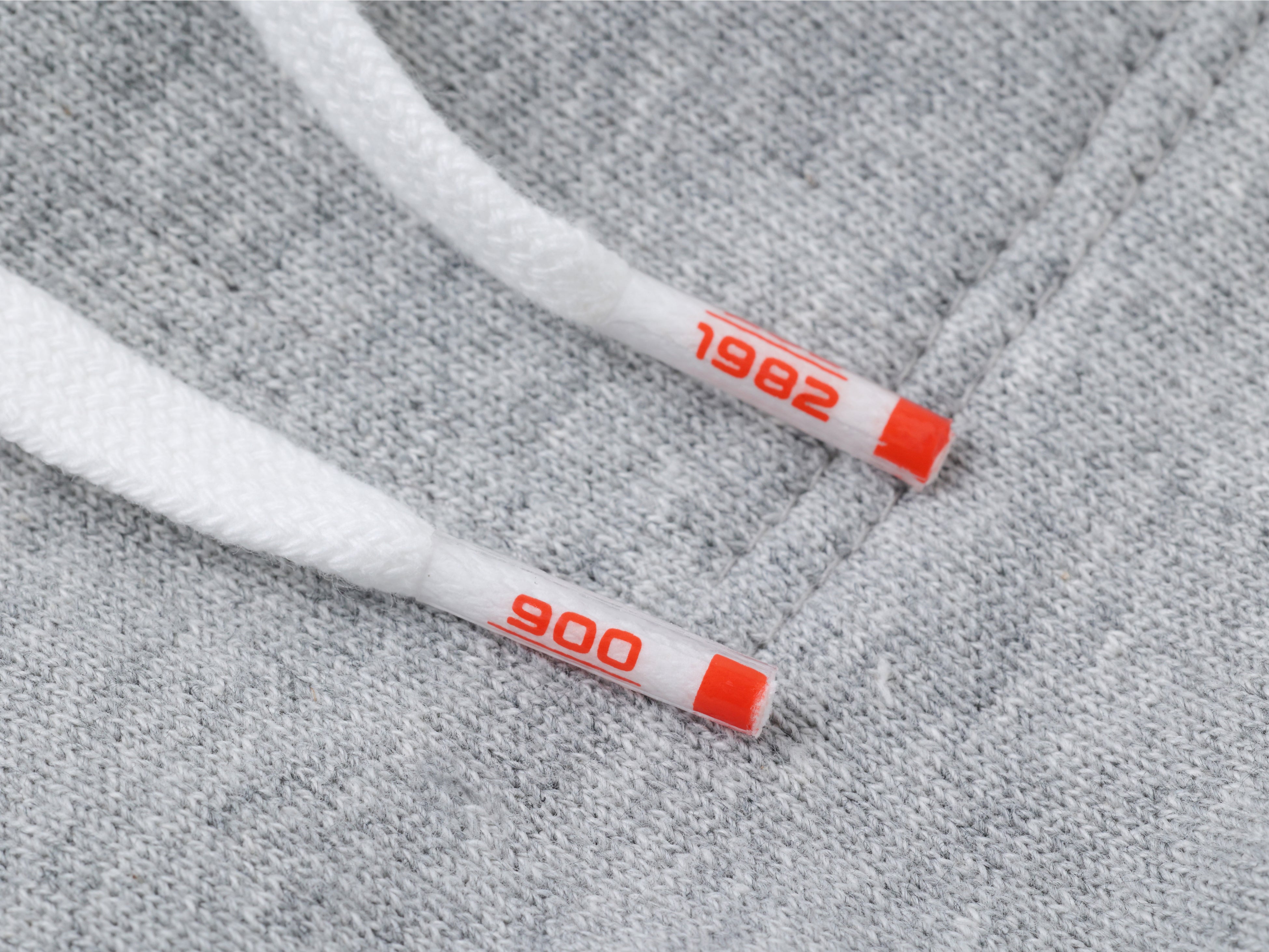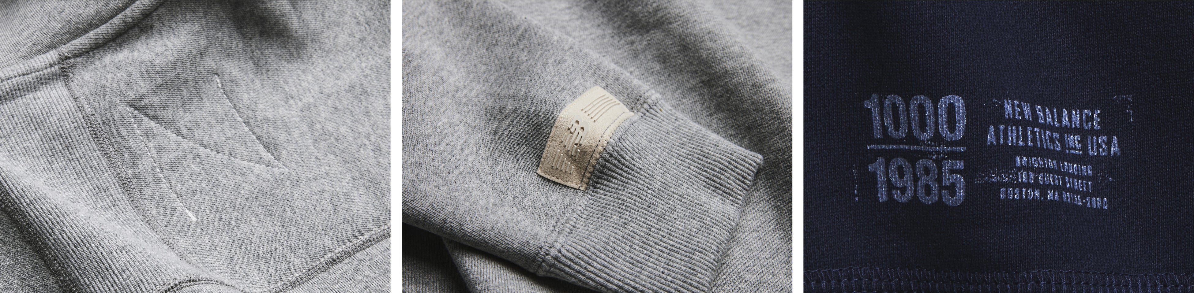 背面に“Nロゴ”ステッチ、後身脇部分のリフレクターヤーン(反射糸)を縫い込み、袖口には1980年代のランニングシューズによくみられる「モーションコントロールデバイス」をモチーフにしたラベルをデザイン。さらに、1985年に誕生したニューバランスのフットウェア「1000 SERIES」をイメージさせる“1000/1985”の隣には、ニューバランスのアメリカ ボストンの本社の住所がプリントされています。架空の開発チームが用いたと思われるタイポグラフィを再現しています。