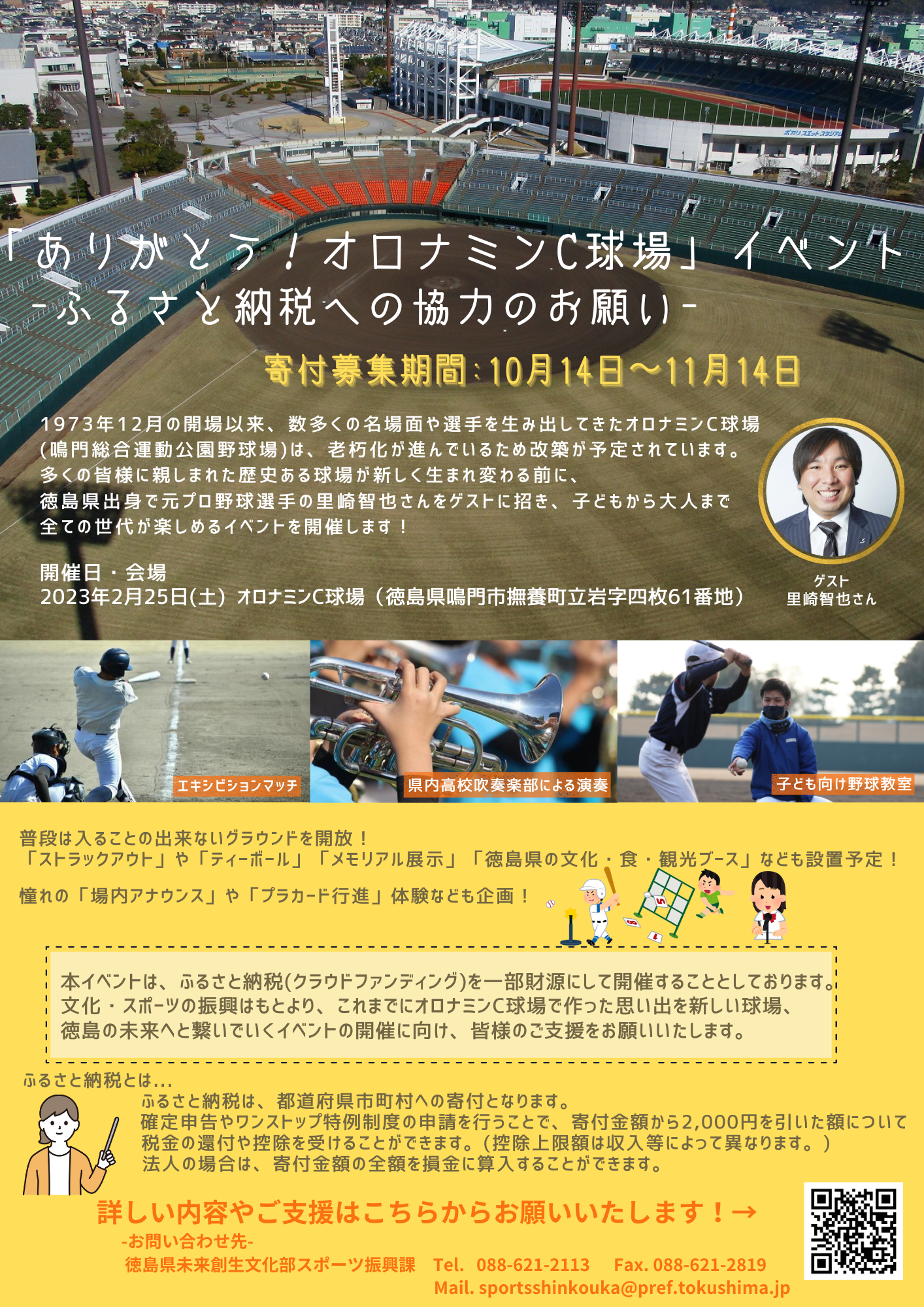 徳島県・野球界の聖地として、皆様に愛されてきたオロナミンC球場は、老朽化に伴い改築が予定されています。そこで県では、夢や希望を育んできた現球場への感謝の気持ちと新球場への期待を込め、里崎智也さん(徳島県出身・元プロ野球選手)をゲストに迎え、誰もが楽しめるスポーツ・文化のイベント「ありがとう!オロナミンC球場」を開催します!