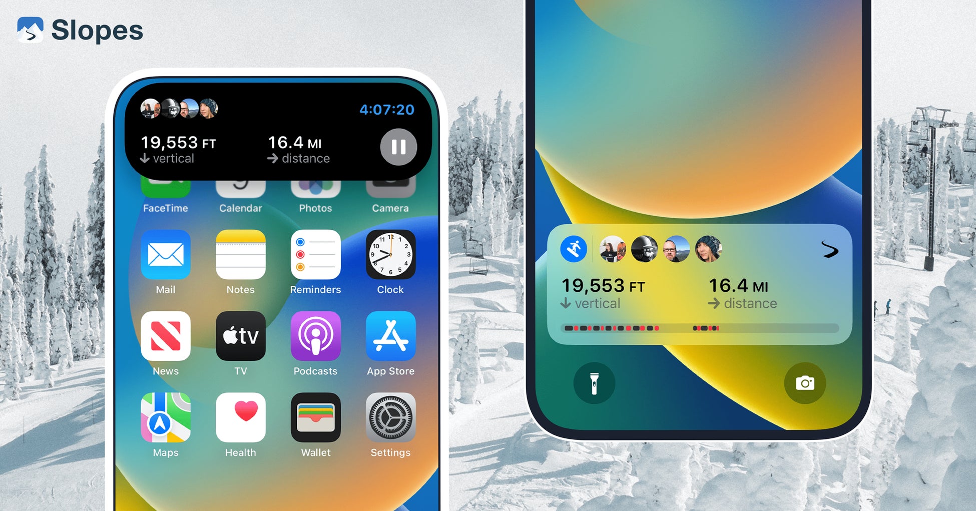 Slopesは、AppleがiOS 16.1で提供予定の新機能「ライブアクティビティ」に対応しています。ロック画面からリアルタイムの滑走記録を確認できるほか、記録の開始/一時停止の操作が可能になります。iPhone14 Pro / Pro Maxをご使用の方は、同機種で登場した機能、「ダイナミックアイランド」でもライブアクティビティをご利用いただけます。
