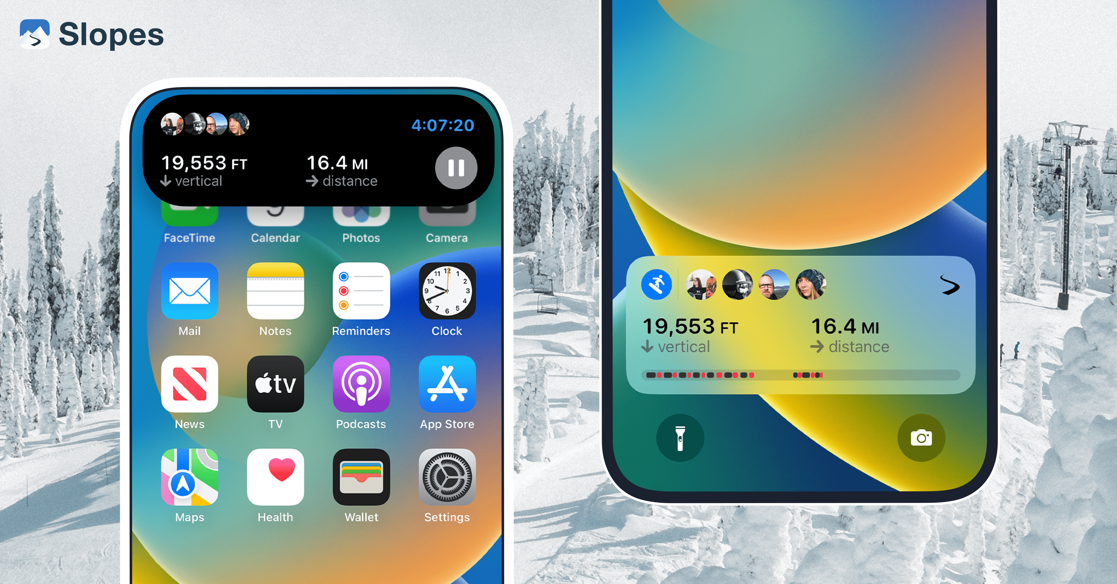 Slopesは、AppleがiOS 16.1で提供予定の新機能「ライブアクティビティ」に対応しています。ロック画面からリアルタイムの滑走記録を確認できるほか、記録の開始/一時停止の操作が可能になります。iPhone14 Pro / Pro Maxをご使用の方は、同機種で登場した機能、「ダイナミックアイランド」でもライブアクティビティをご利用いただけます。